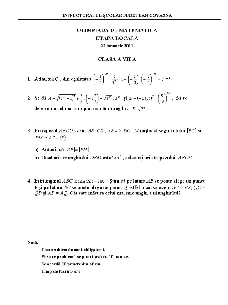 Olimpiada De Matematica Etapa Locală Inspectoratul Scolar