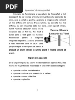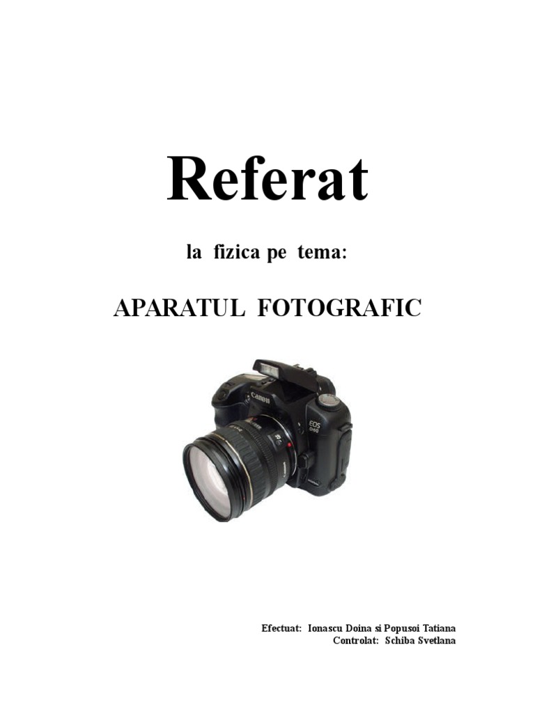 Aparatul foto fizica. Acest proiect trateaza aparatul de fotografiat. Mai jos poate fi vizualizat un extras din document aprox. Aparatul fotografic sau aparat de fotografiat este un aparat optic cu ajutorul căruia pot fi obținute imagini reale ale obiectelor. Se diferenţiază prin modul în care captează memorează şi prelucrează imaginile fotografice.