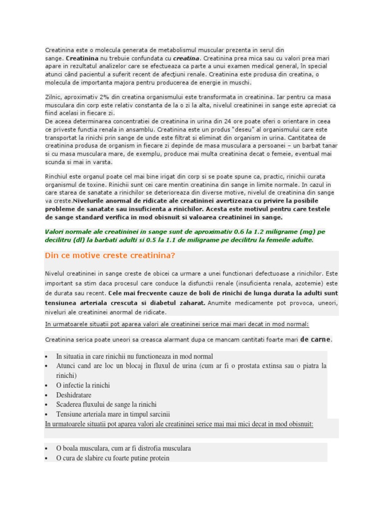 Ce este creatinina marita. Rinichii unei persoane sanatoase filtreaza creatinina si alti produsi reziduali din sange iar acesti produsi ajung in urina pentru a fi eliminati. Creatinina nu trebuie confundata cu creatina creatinina prea mica sau cu valori prea mari apare in rezultatul analizelor care se efectueaza ca parte a unui examen medical general în special atunci când pacientul a suferit recent de afecţiuni renale. Afla tot ce trebuie sa stii despre creatina pentru a avea performantele dorite la orice antrenament.
