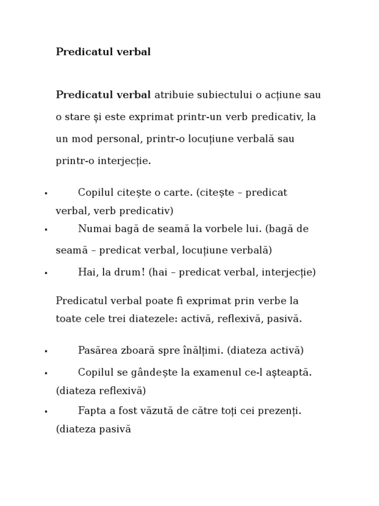 Ce este predicatul. Predicatul verbal predicatul este partea principala de propozitie care arata. Astfel însuși sensul unei propoziții și existența ei depind de predicat drept pentru care analiza unei propoziții începe mereu cu identificarea acestuia. în general predicatul indică ce face cine este ce este cum este subiectul. Predicatul este partea principală de propoziție de care depinde existența unei propoziții care spune ceva despre subiect conferă subiectului o acțiune o caracteristică o stare o identitate sau o însușire.
