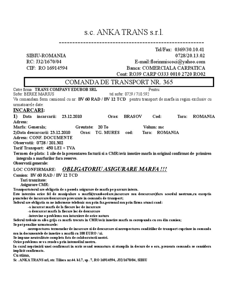 Academia edu is a platform for academics to share research papers. 3 orice conflict decurgand din prezentul contract care nu a fost solutionat pe cale amiabila in termen de 30 de zile este de competenta instantelor judecatoresti din circumscriptia locului unde isi are sediul prestatorul. Ce e frumos la acest model este ca este creat sa incapa intr o singura pagina a4. Confirmarea de comanda transport marfa actul juridic nascut ca urmare a comenzii de transport trebuie sa ti vina intr un timp rezonabil.
