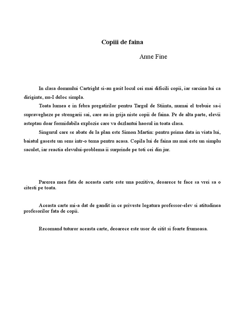 Copiii de faina de anne fine de little red reader hood. Dar chiar si asa dupa ce terminam cartea respectiva daca reusim consider ca ar trebui sa ne oprim putin gandurile revoltatoare in legatura cu toate aspectele ce ne a. Vrei sa copertam acest produs pentru 5 lei suplimentar. Un alt titlu celebru semnat de autoarea britanic ă este doamna doubtfi re publicat în 1987 în curs de apariţie la editura arthur ecranizat de twentieth century fox în 1993.
