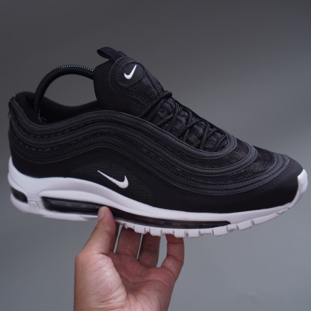 Featuring the iconic full length air unit to the midsole along with the textured upper these sneaks are a true throwback to the late nineties. With its multi layered retro futuristic upper a blank canvas for countless palette arrangements this particular edition for the ladies goes into the dark with a monochromatic makeup of black. Other men s and women s air max 97 shoes are hitting the scene in trend savvy colors like metallic rose gold and sleek monochromatic all black. The newest colorway of the iconic air max 97 in sleek black and white features reflective material that flows with its unmistakable wave pattern.