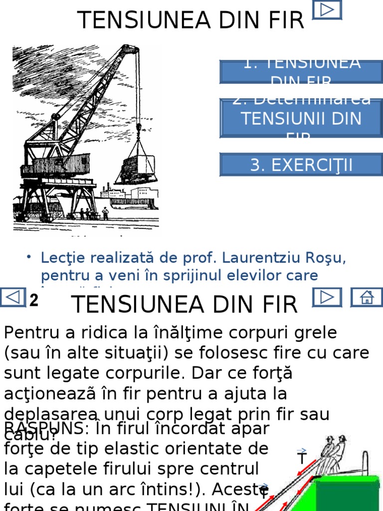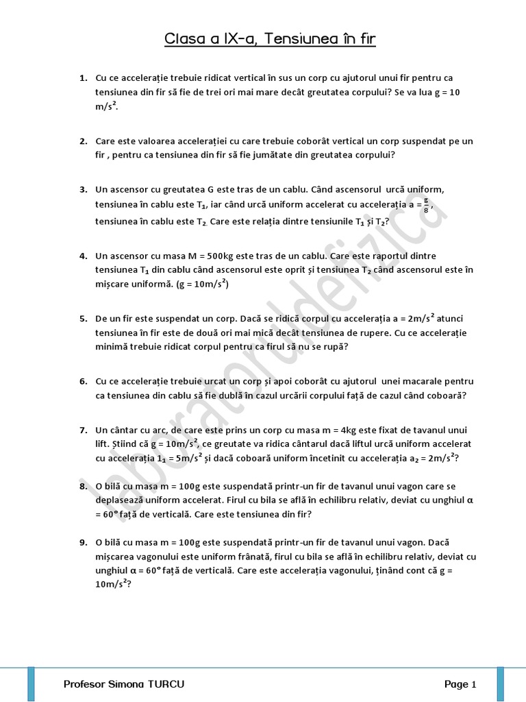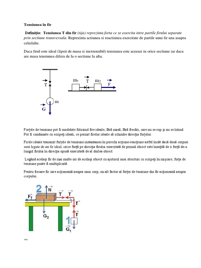 Astfel de tensiuni in cabluri sau bare din cadrul diferitelor constructii poduri acoperisuri etc trebuie neaparat cunoscute pentru a alege bara sau cablul de grosimea corespunzatoare ca sa nu se rupa. N firul ncordat apar cablu. Tensiunea din fir pentru a ridica la nlime corpuri grele sau n alte situaii se folosesc fire cu care sunt legate corpurile. Neglijand frecarea sa se calculeze acceleratia si 232e42c stemului si tensiunea din firul de legatura.