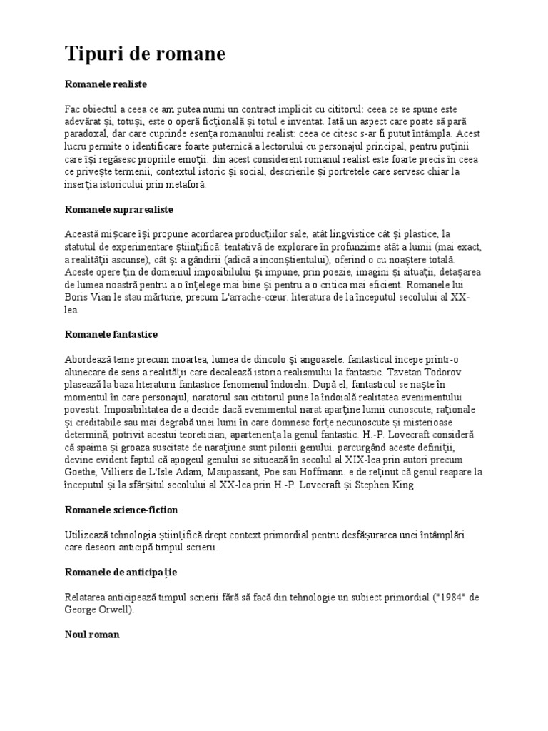 30 martie 2020 12 32. Trebuie remarcat faptul că cele două categorii nu sunt exclusive deci o lucrare poate fi comercială și literară. Roman de capă și spad. Romane de război 3 c 2 p romane ale realismului magic 6 p romane realiste 4 p romane în versuri 2 p s romane satirice 7 p.